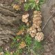Ножка Чешуйницы обыкновенной также очень характерна: она цилиндрическая, часто изогнутая, плотная, до 15 см в высоту и 1-3 см в толщину. Над кольцом она обычно светлая, гладкая или слегка волокнистая, а под кольцом – обильно покрыта отогнутыми, направленными вниз чешуйками, которые по цвету соответствуют чешуйкам на шляпке, но часто выглядят светлее. На фотографии это хорошо видно: ниже почти незаметного кольца (или его остатков) ножка покрыта мелкими чешуйками. Основание ножки может быть немного утолщённым и часто погружено в субстрат.